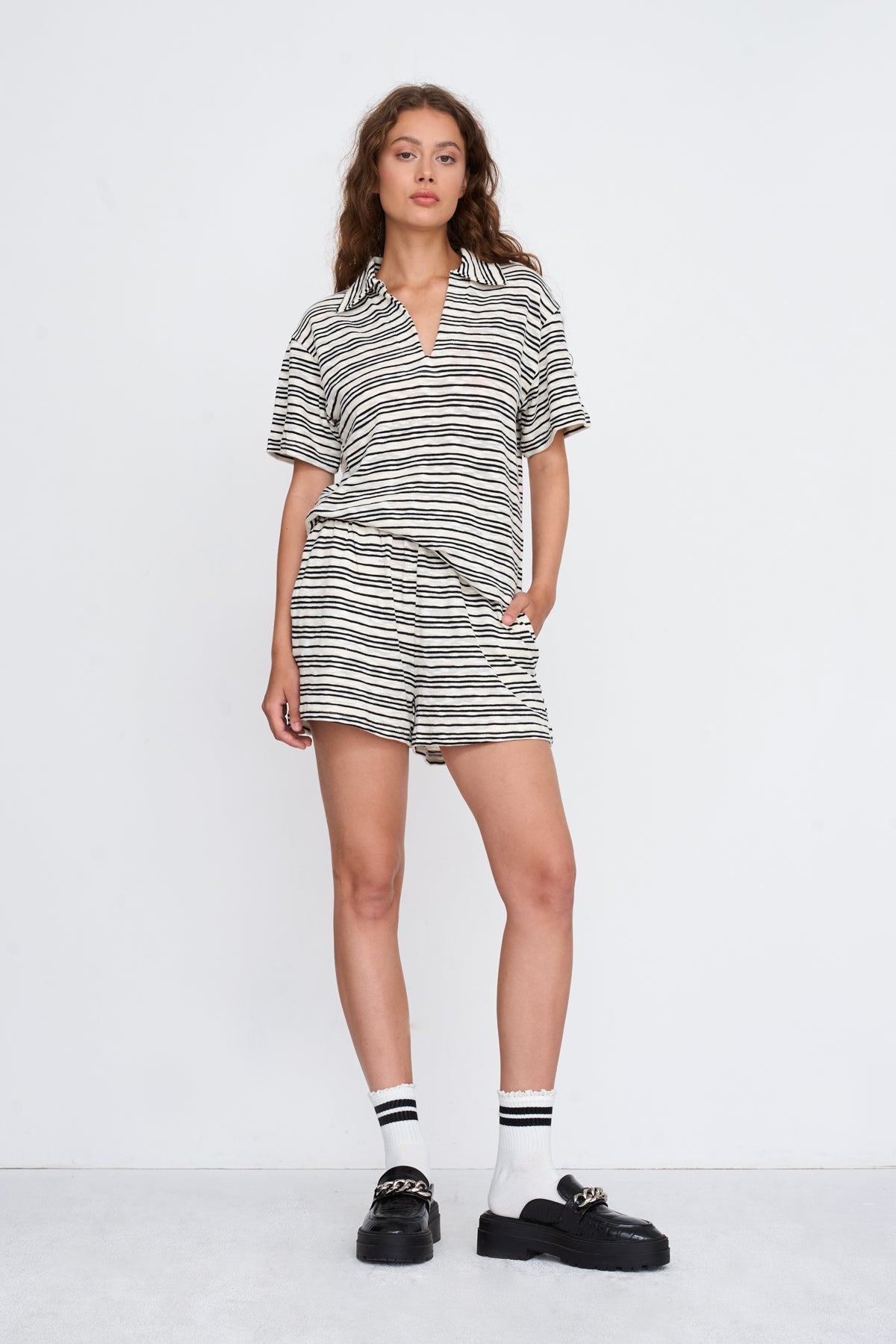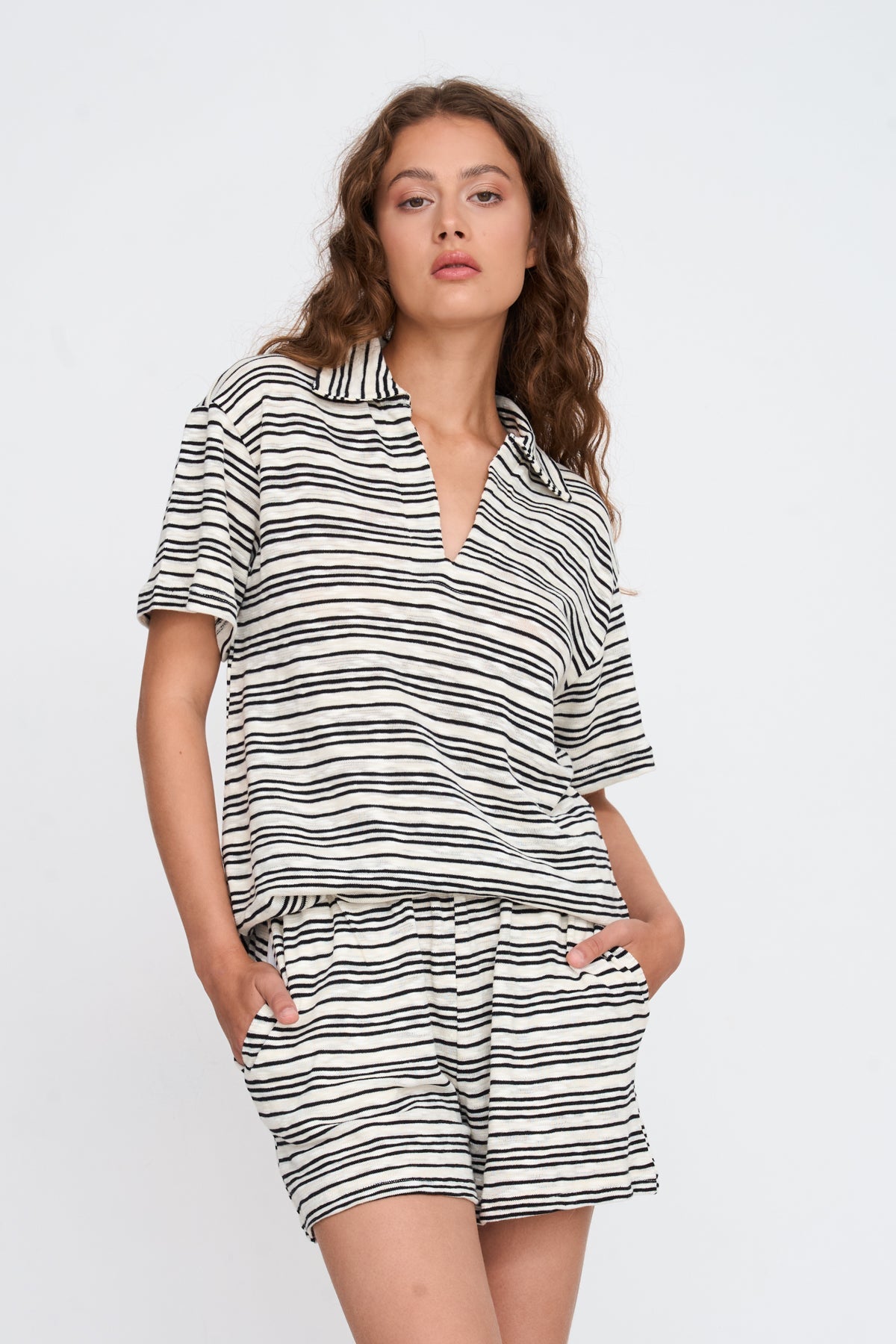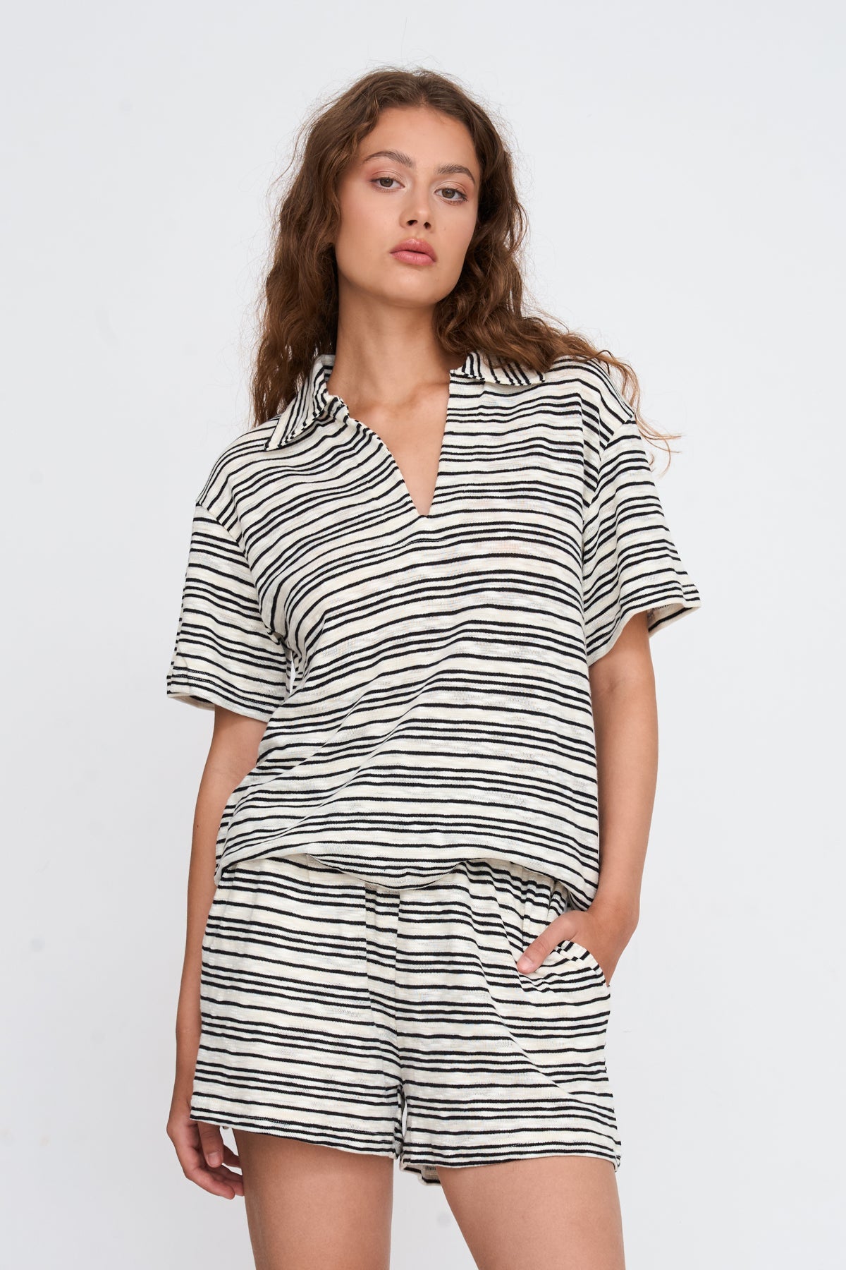 Gestricktes Shirt mit Kragen und V-Ausschnitt, schwarz gestreift